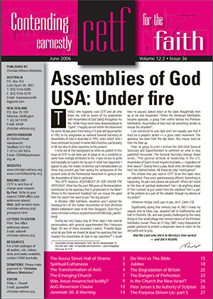 This will be the last CETF for the year making a total of three not four for 2014. To compensate it contains twice as many articles and double the Resource Material as that in the normal editions. We are pleased to be able to publish CETF # 68 in Australia and by an unexpected late notice of financial guarantee it will also be distributed in New Zealand and the United Kingdom (UK) in hard print. It will be available elsewhere on-line, God willing.